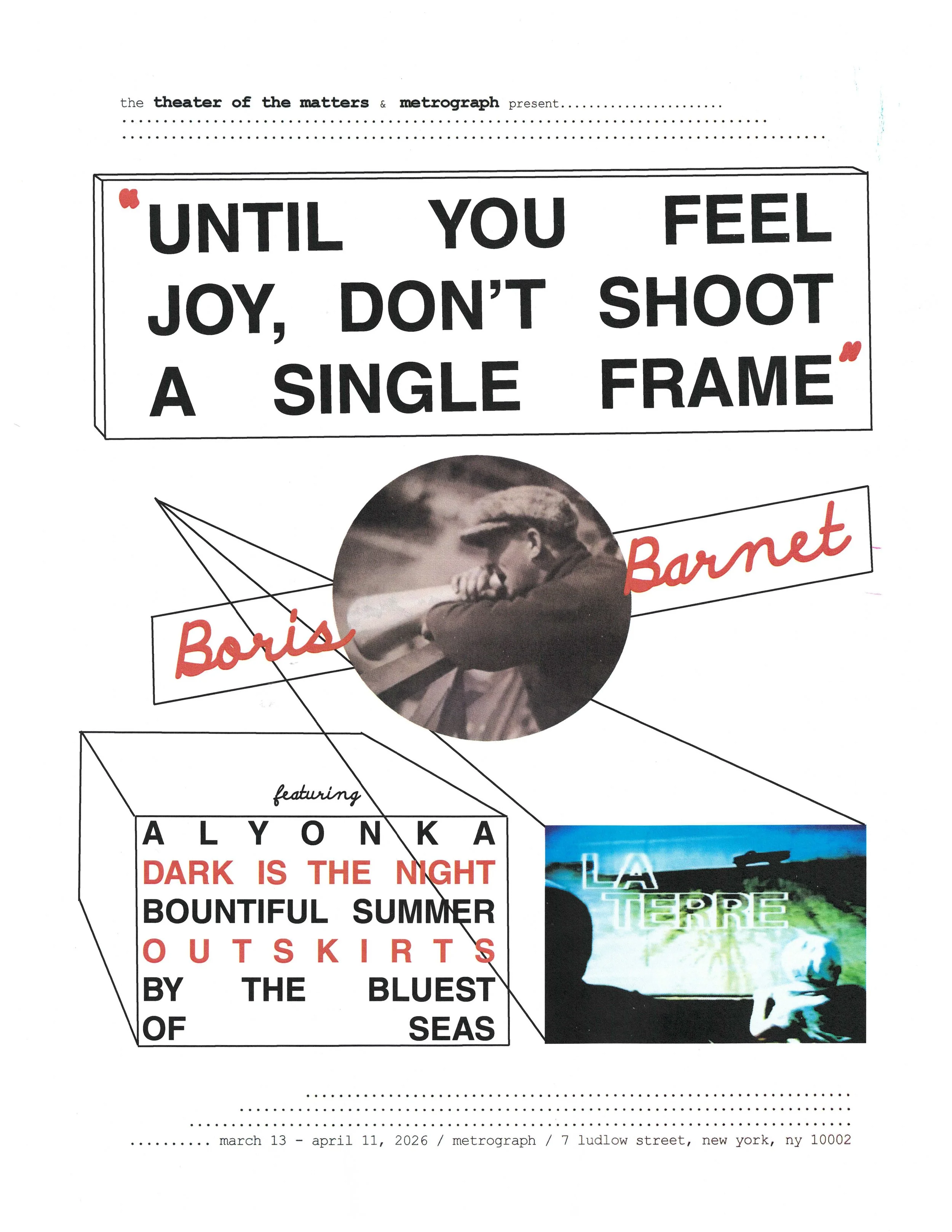 We’re pleased to co-present a selection of screenings during Boris Barnet, A Soviet Poet, a month-long retrospective dedicated to the boxer-turned-moviemaker and true wonder of intuition. This New York program follows in the wake of Boris Barnet: A Cinema Despite Life, programmed by Hannah Yang at Doc Films in Chicago, which concludes with the symposium By the Very Blue Sea: Boris Barnet and His Films, taking place from March 6 - 7, 2026.